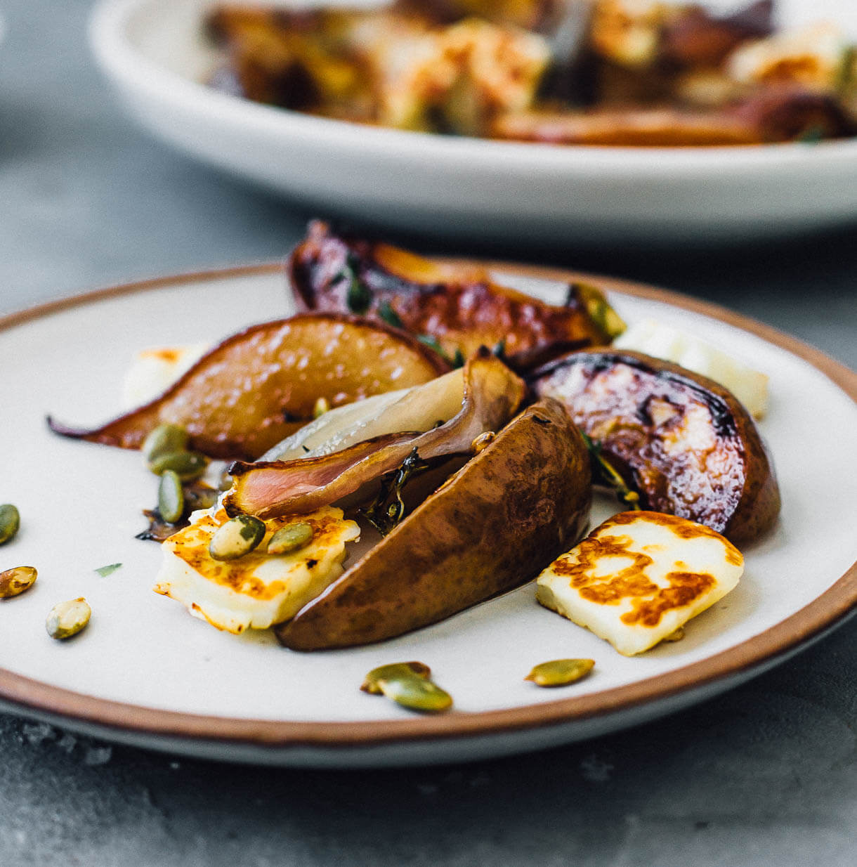Heat a non-stick skillet to medium high. Add slices of halloumi and cook for 1-2 minutes on each side, until browned and soft. Add halloumi to pan and toss with other ingredients. Empty onto a serving plate and toss with toasted pepita seeds. Serve.